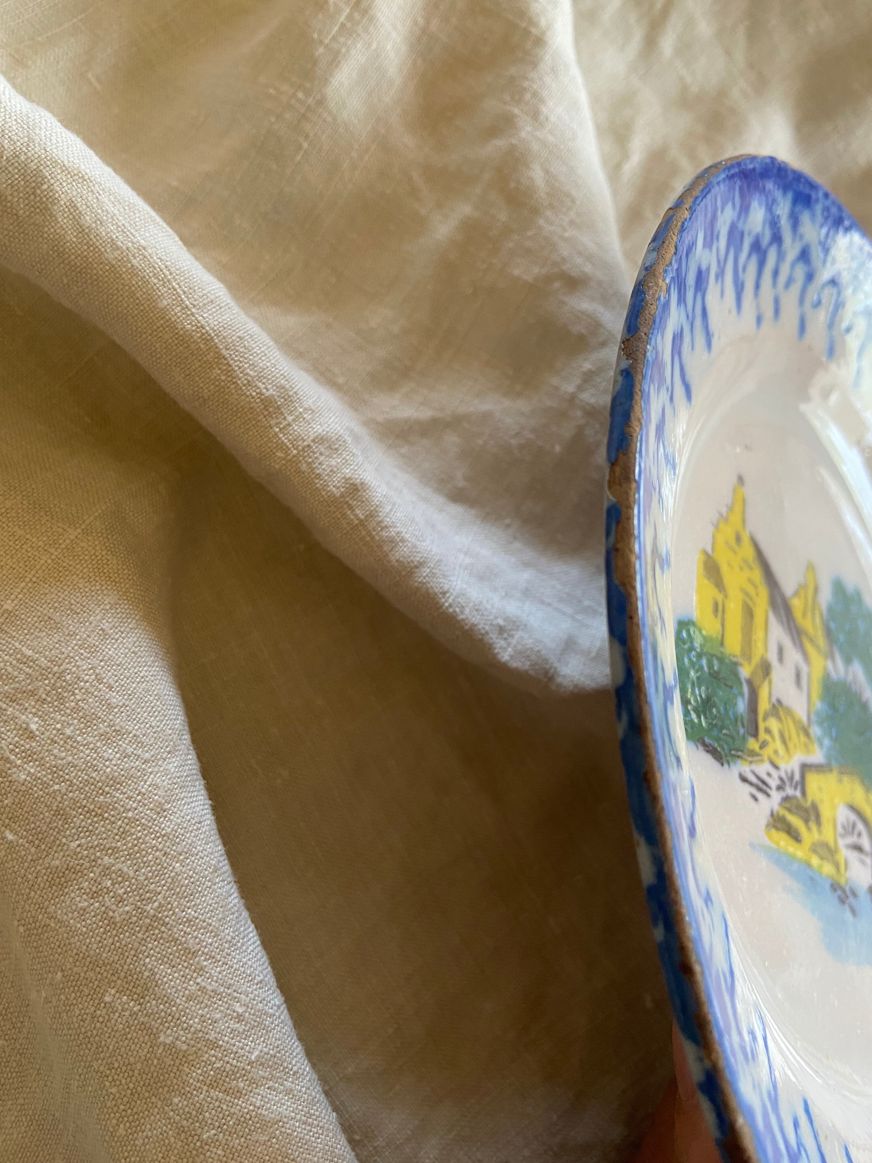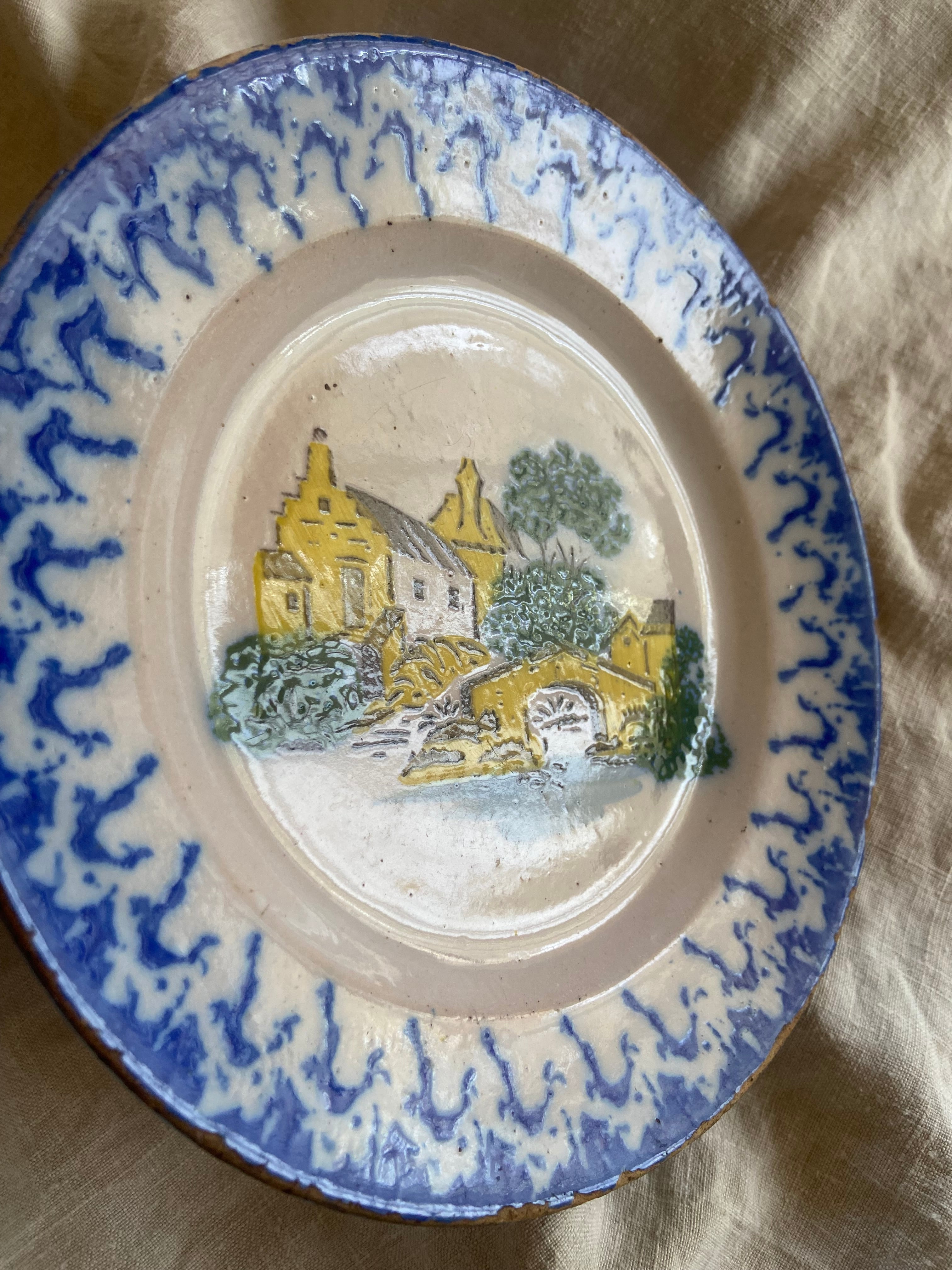 なんだかとっても懐かしい感じのする建物や橋などがステンシルの技法とハンドペインティングで描かれたプレート。木の部分はスタンプをポンポンと押したスタイル