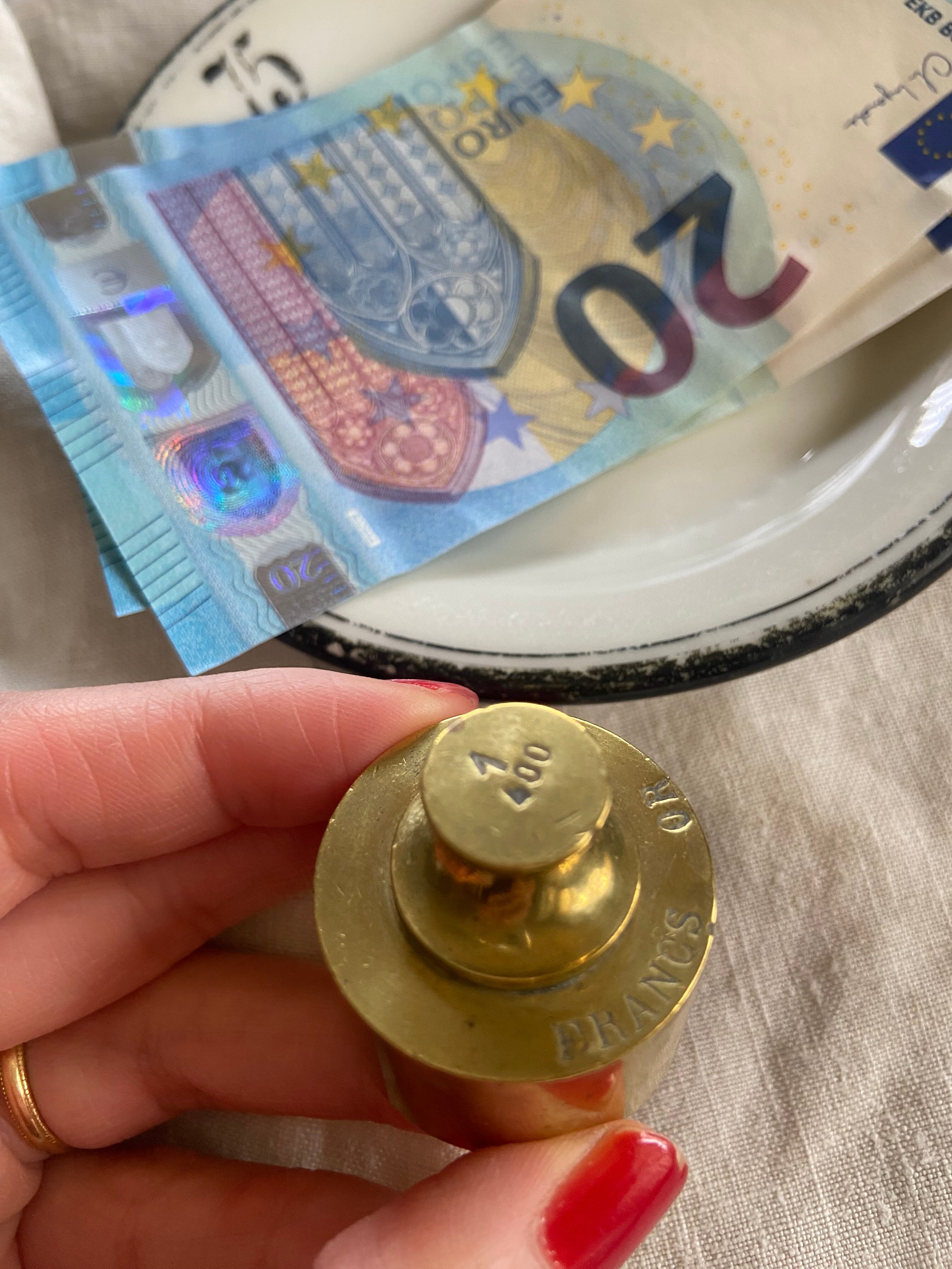 金本体制の時代、銀行や金細工師が金貨の重さを量るために使われていたもので、金貨400フラン分と同じ重さです。