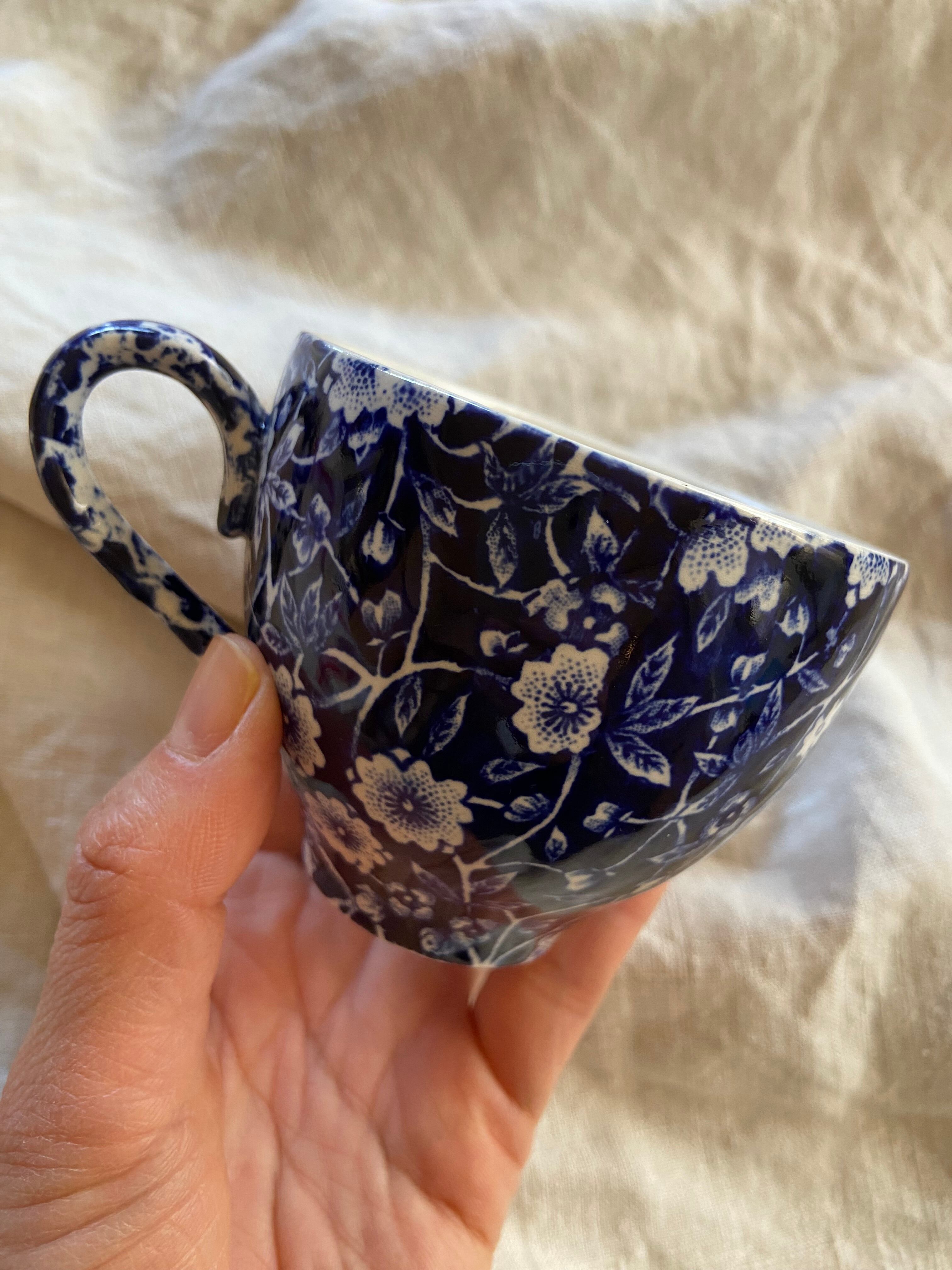 青地に小さな白い花がたくさんのカップ。