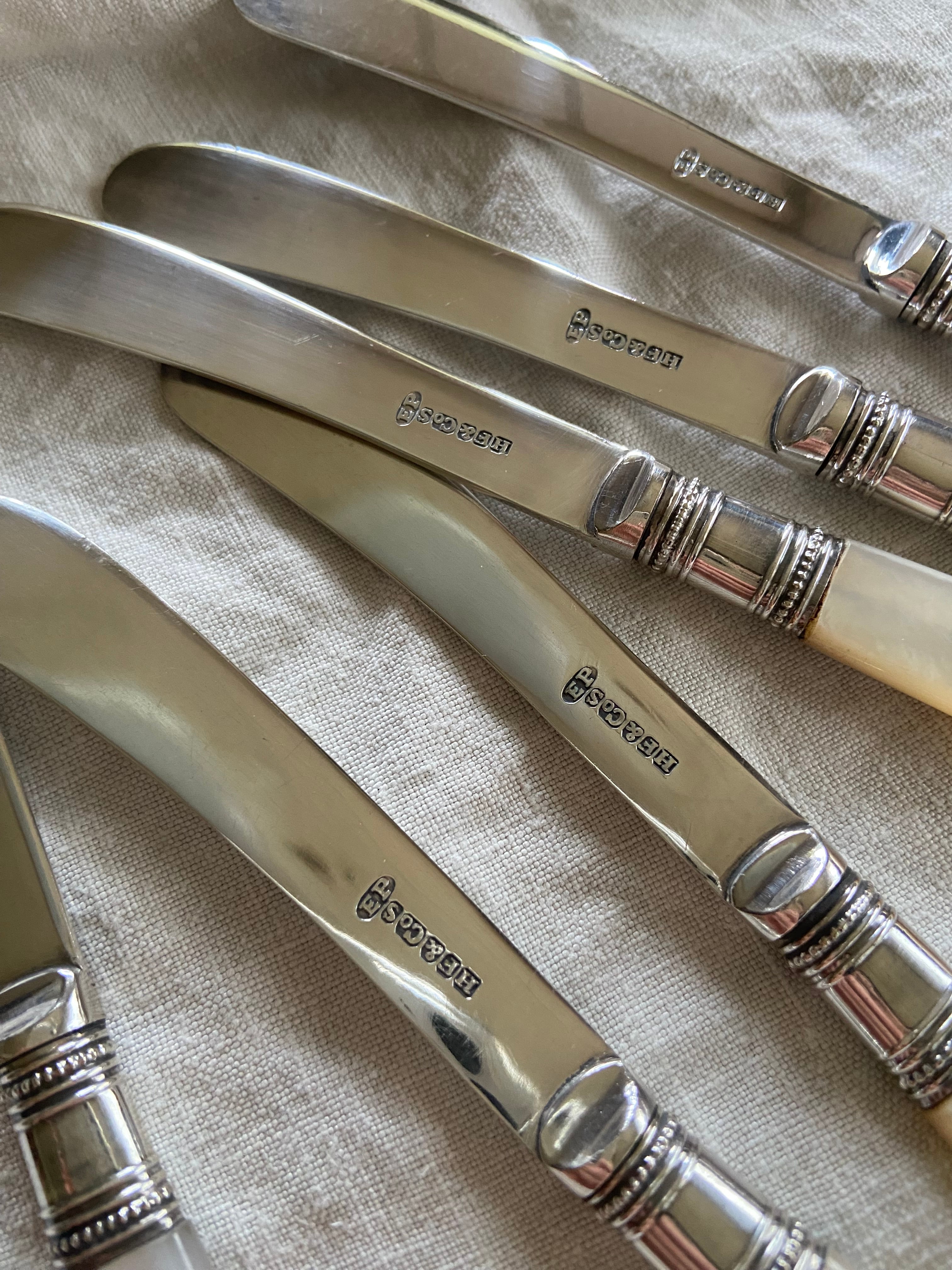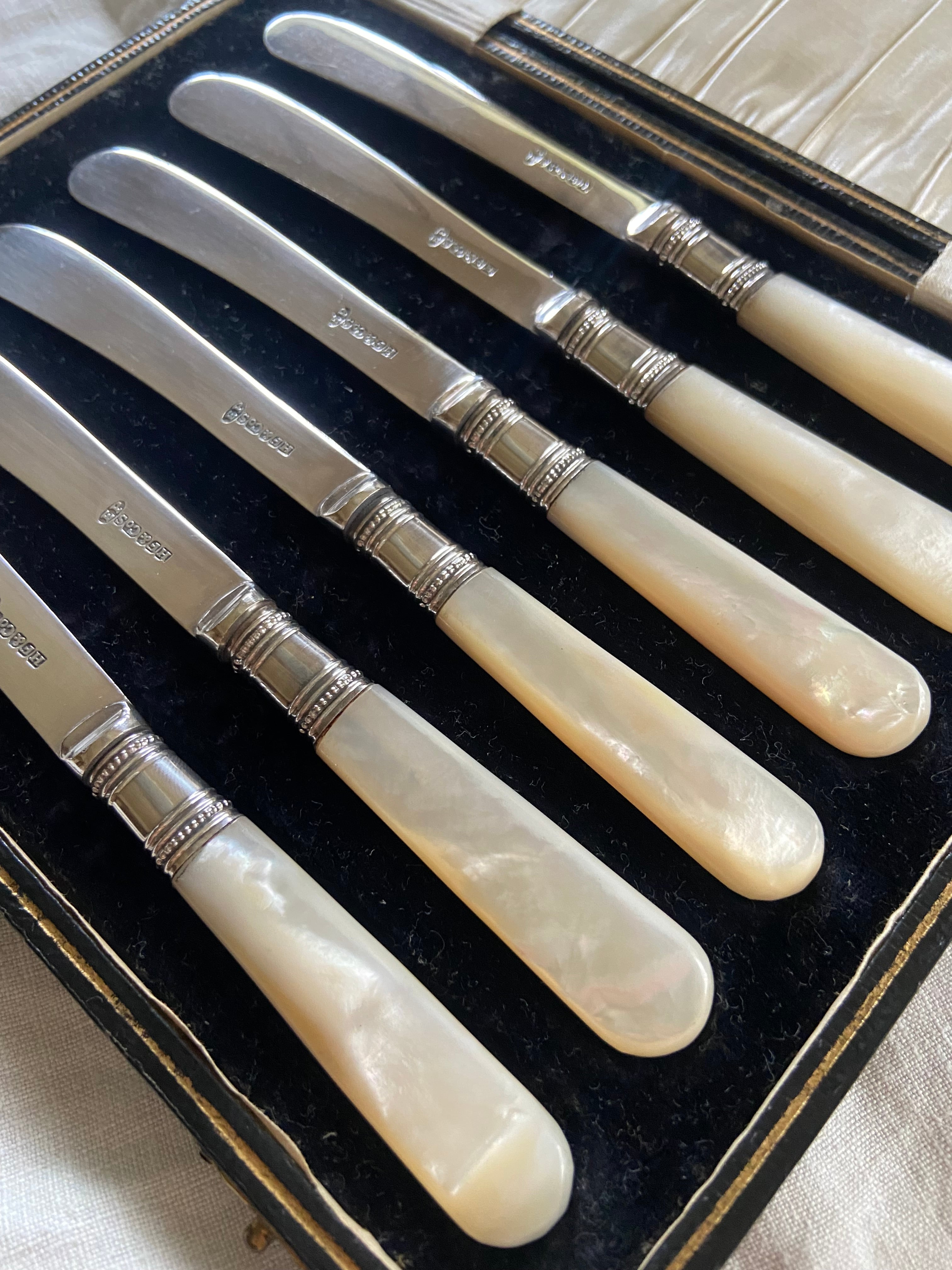 やわらかな光沢のマザーオブパールのハンドルが美しく、パンやチーズ、ジャム用としても日常のテーブルがさりげなく映えます。