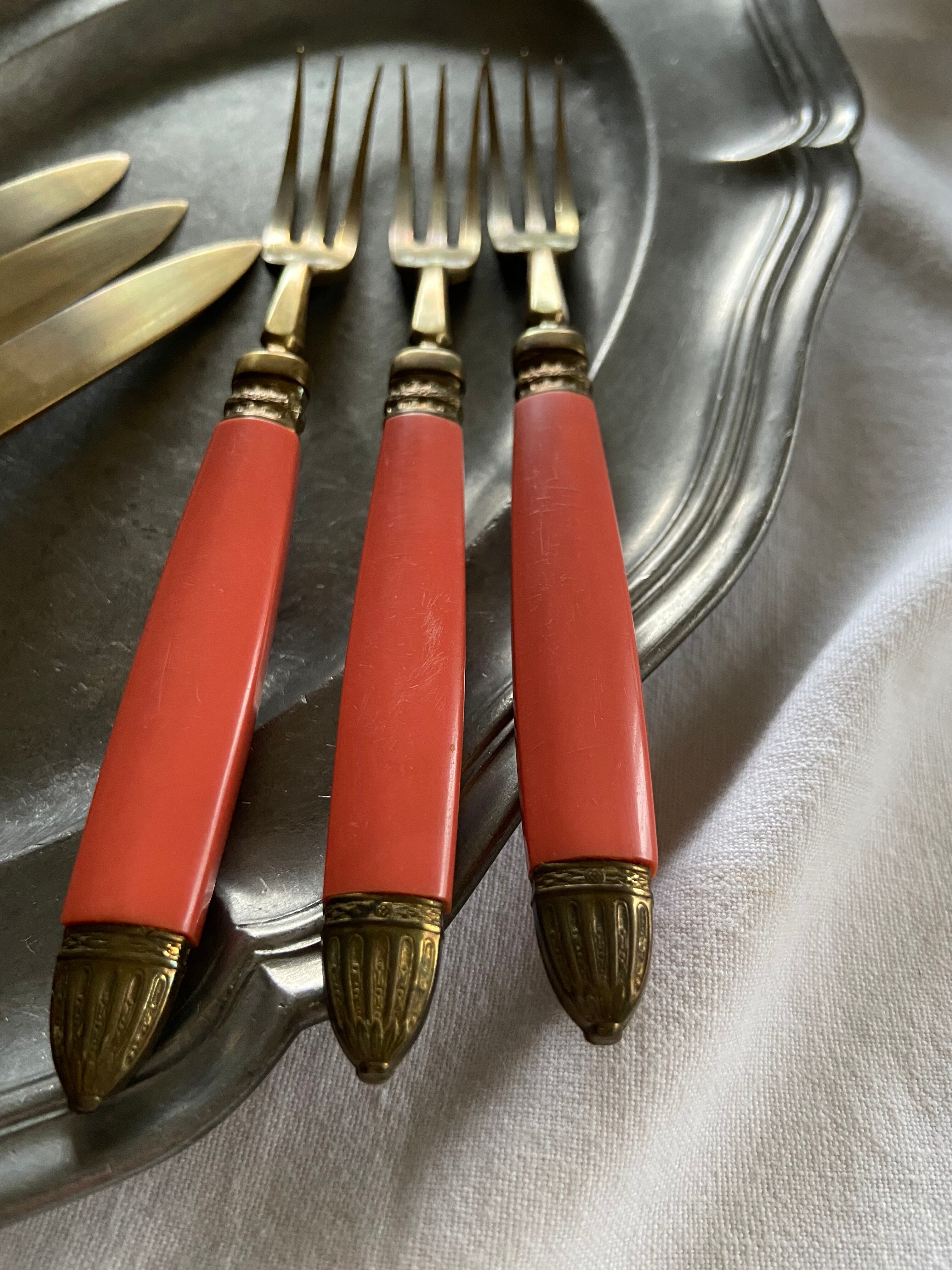 フランスヴィンテージ、ピンクの持ち手が素敵なフォークとナイフになります。