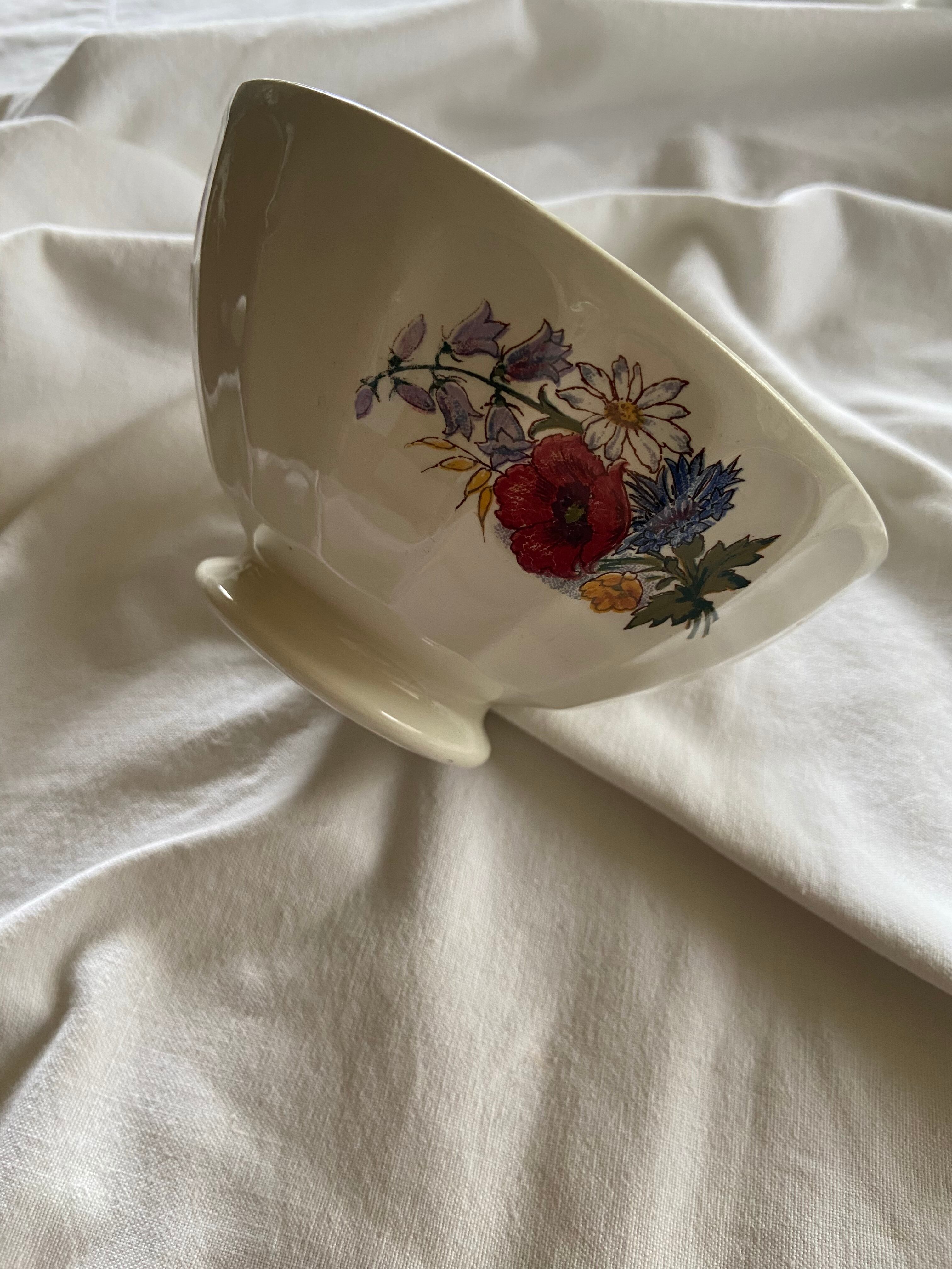 縁に極小のチップがいくつかと、2mmほどのチップがあります。内側にも少しカトラリー跡が見られますが全体的にツヤもあり、良い状態かと思います。