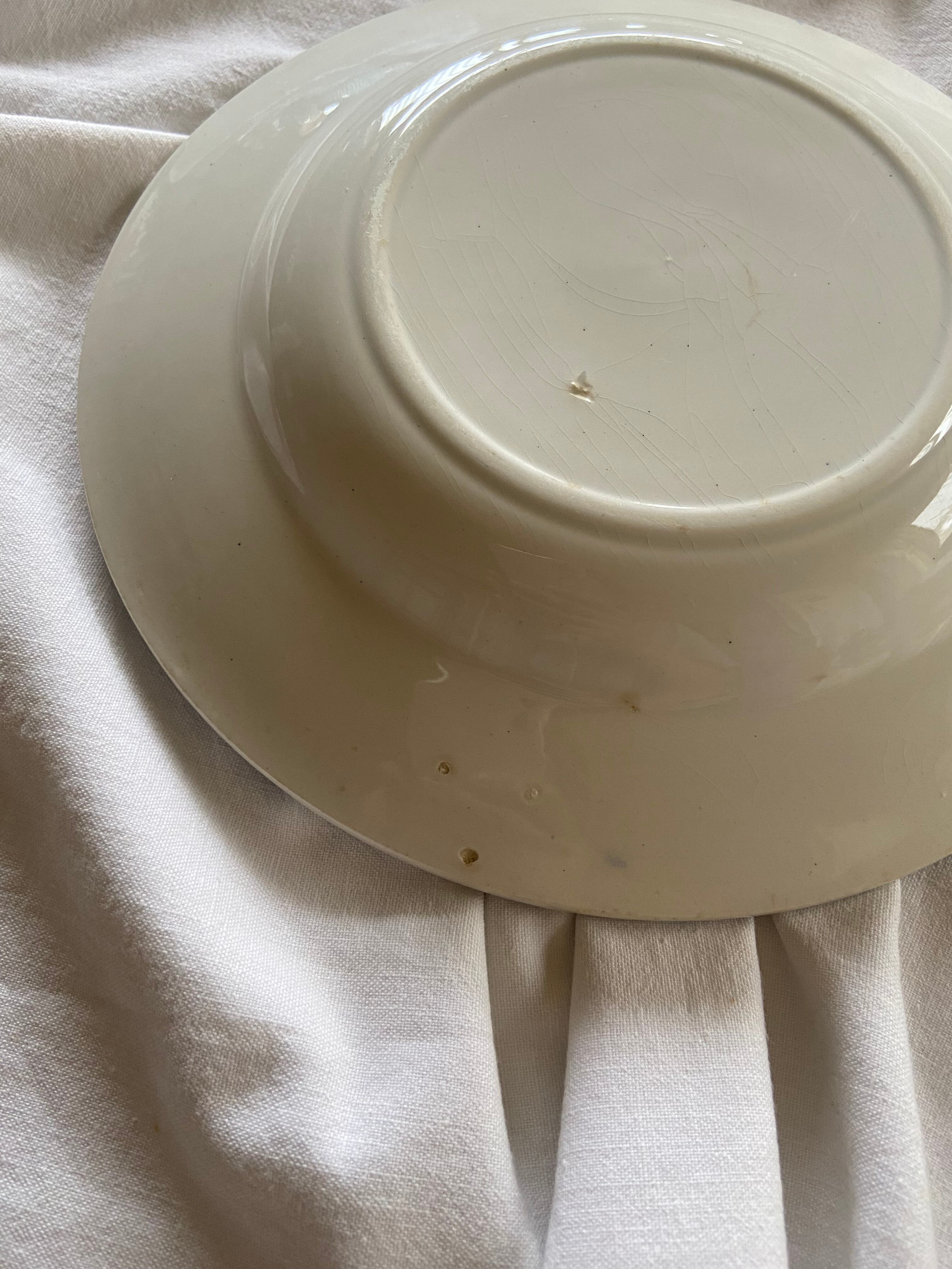表側はカトラリー跡もほぼ無く、艶もあり綺麗な状態ですが、裏側の端のところに小さな欠け?釉薬の取れ?が見られます。インクの飛び散りもあります。