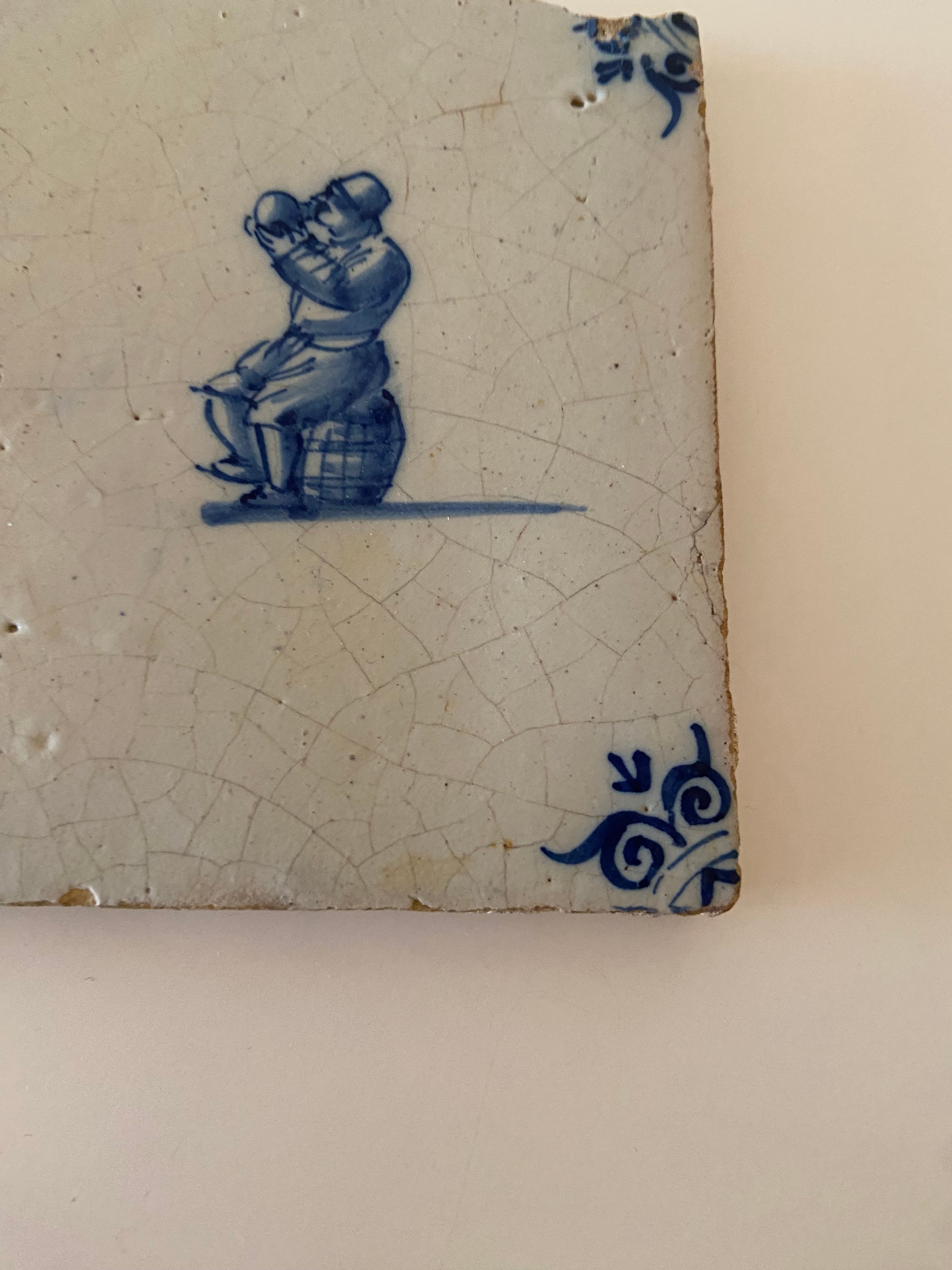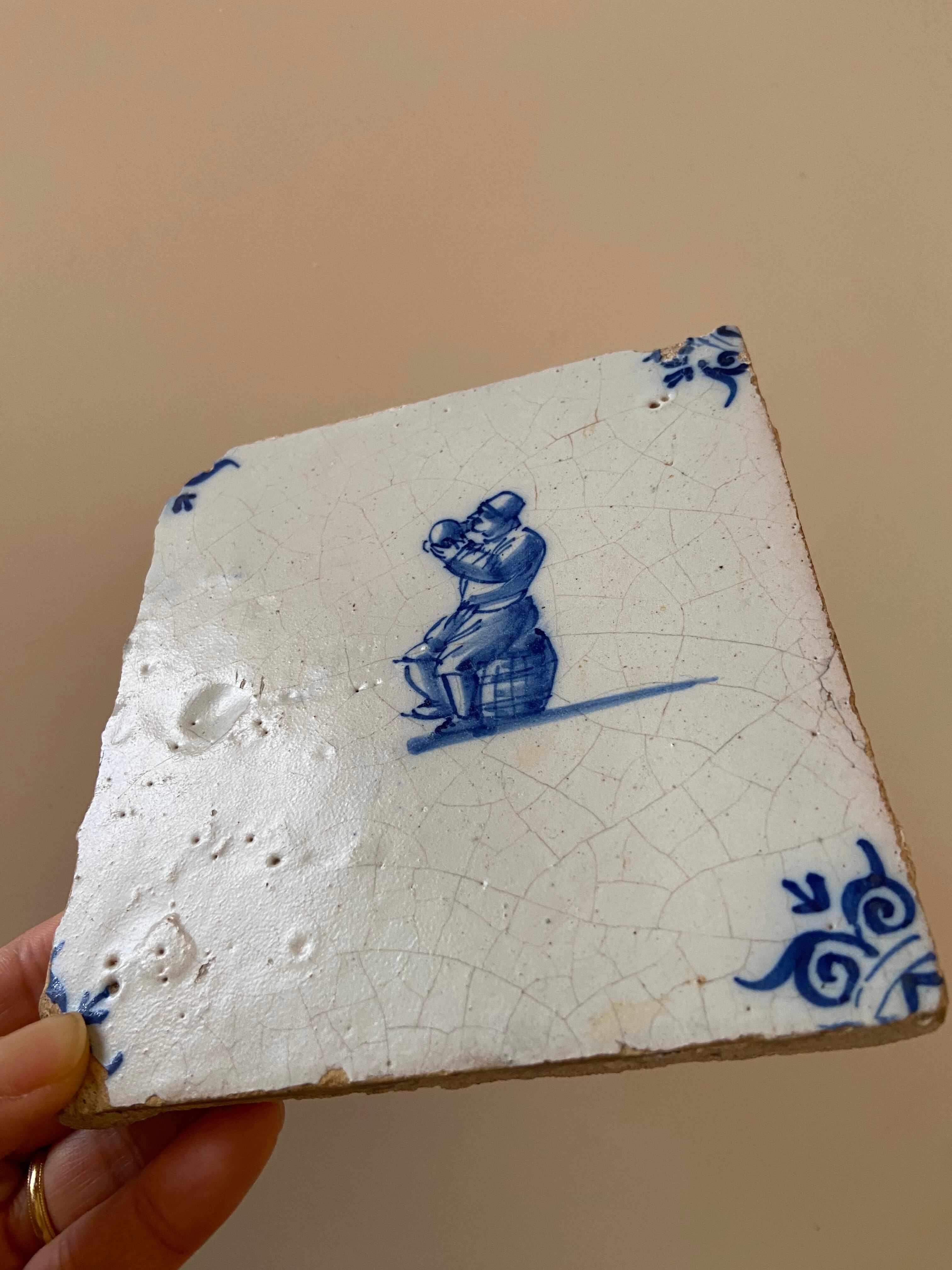 樽にちょこんと腰掛けてぐびぐびっとボトルを飲んでいるおじさまが描かれたタイル