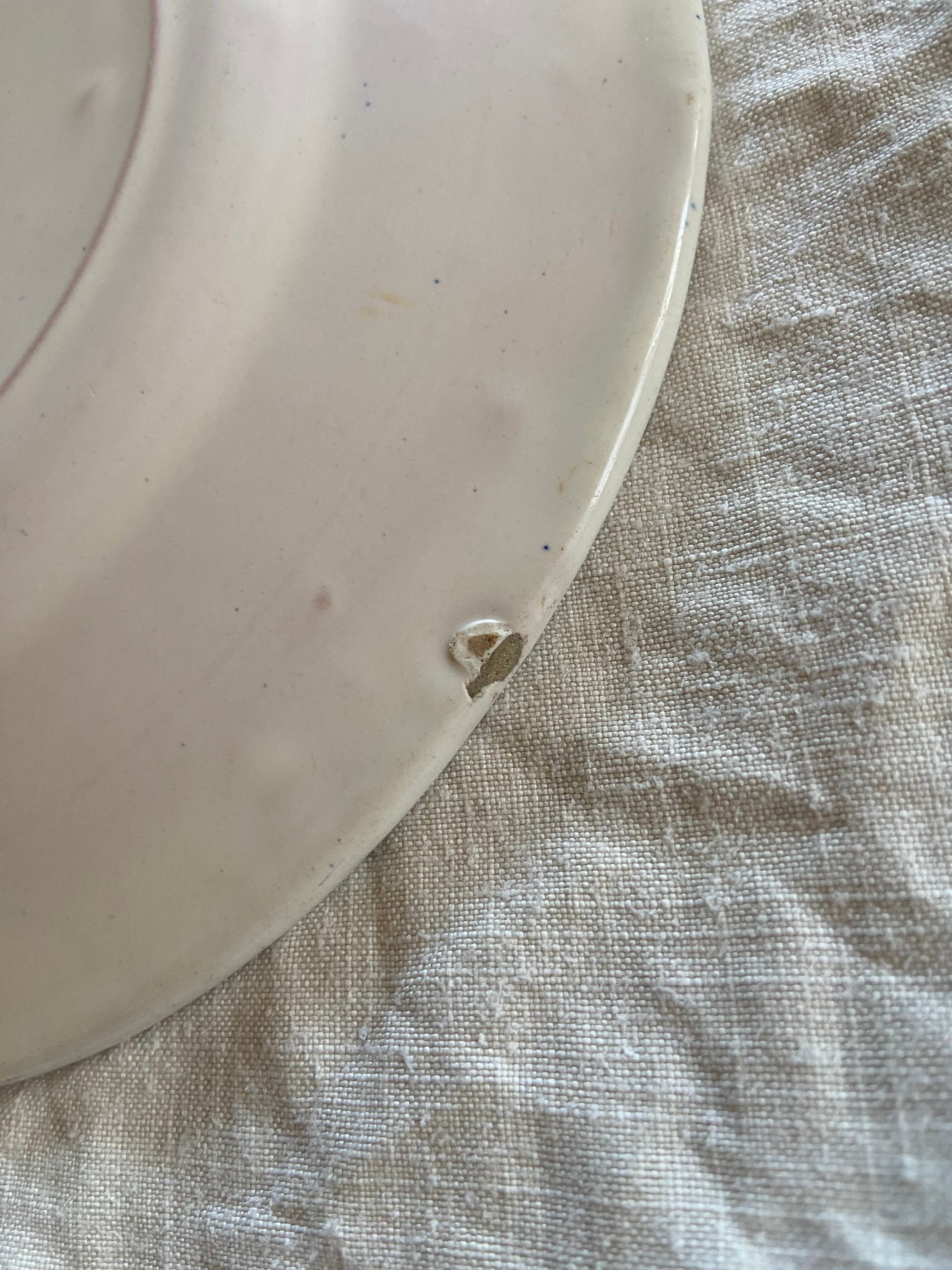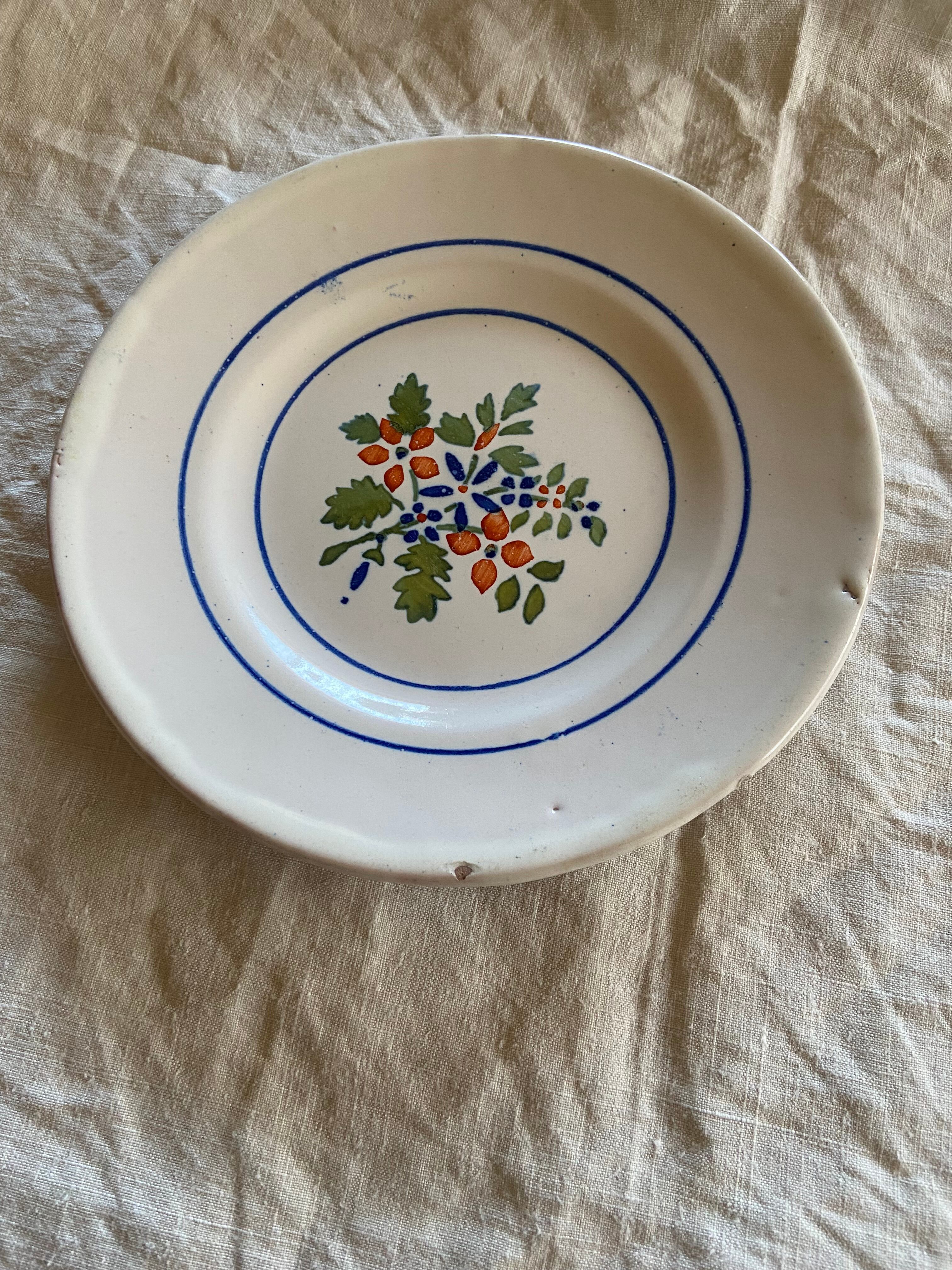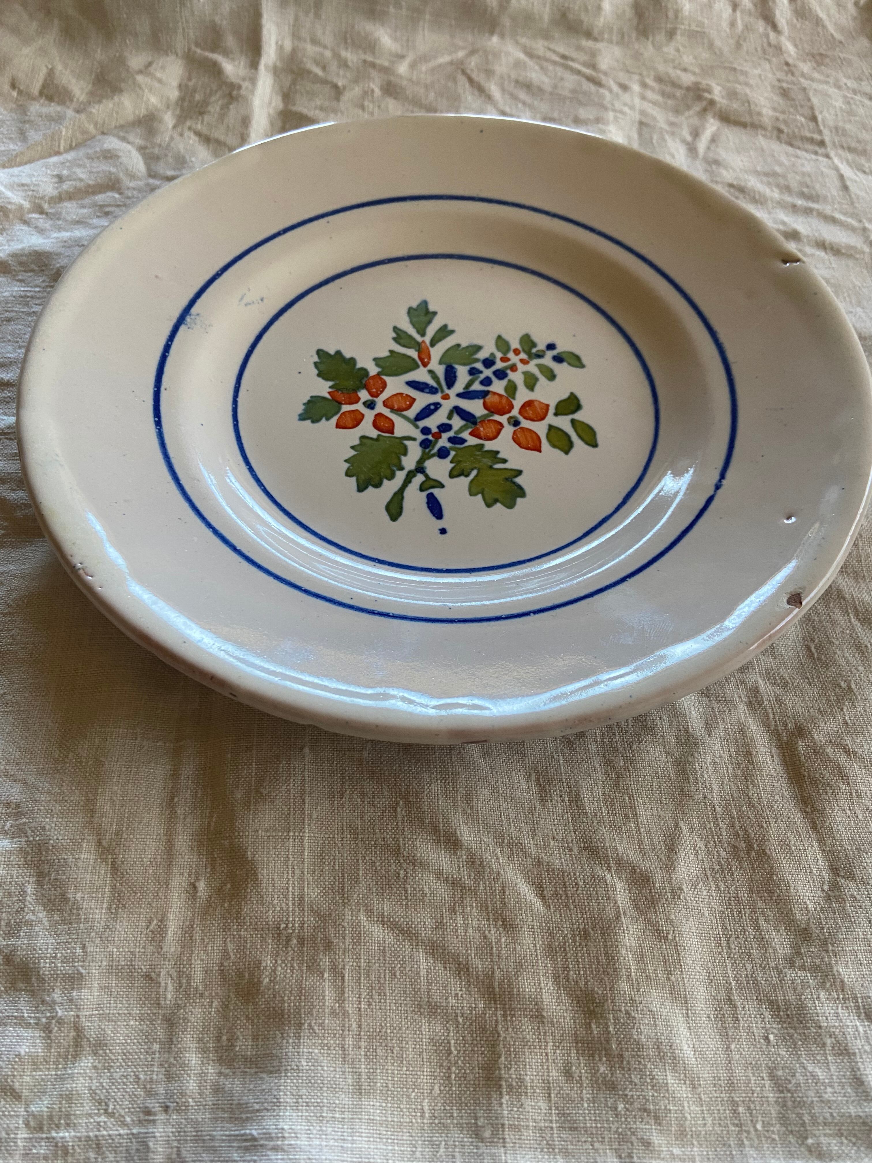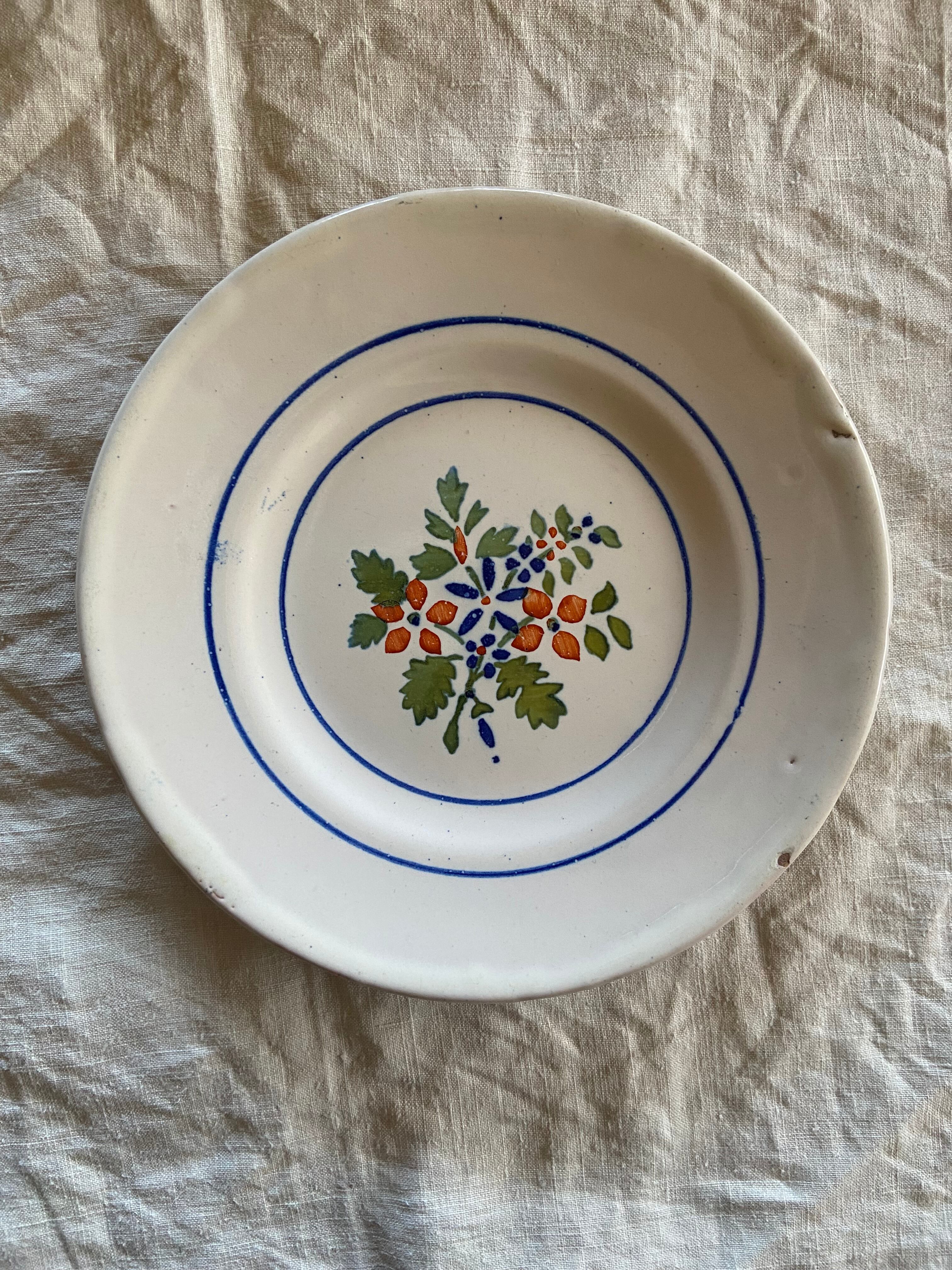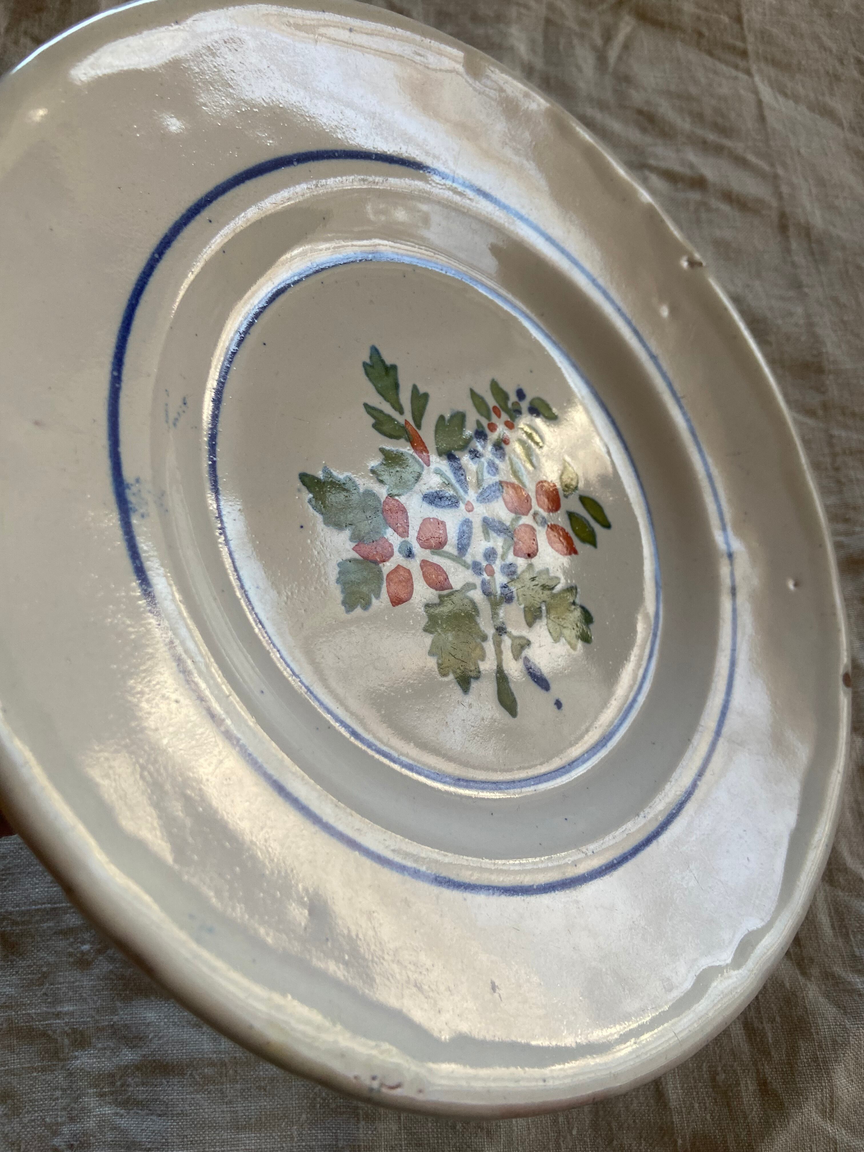 白いぽってりした釉薬の感じと、一つひとつステンシルで描かれたお花が素敵な一枚です。