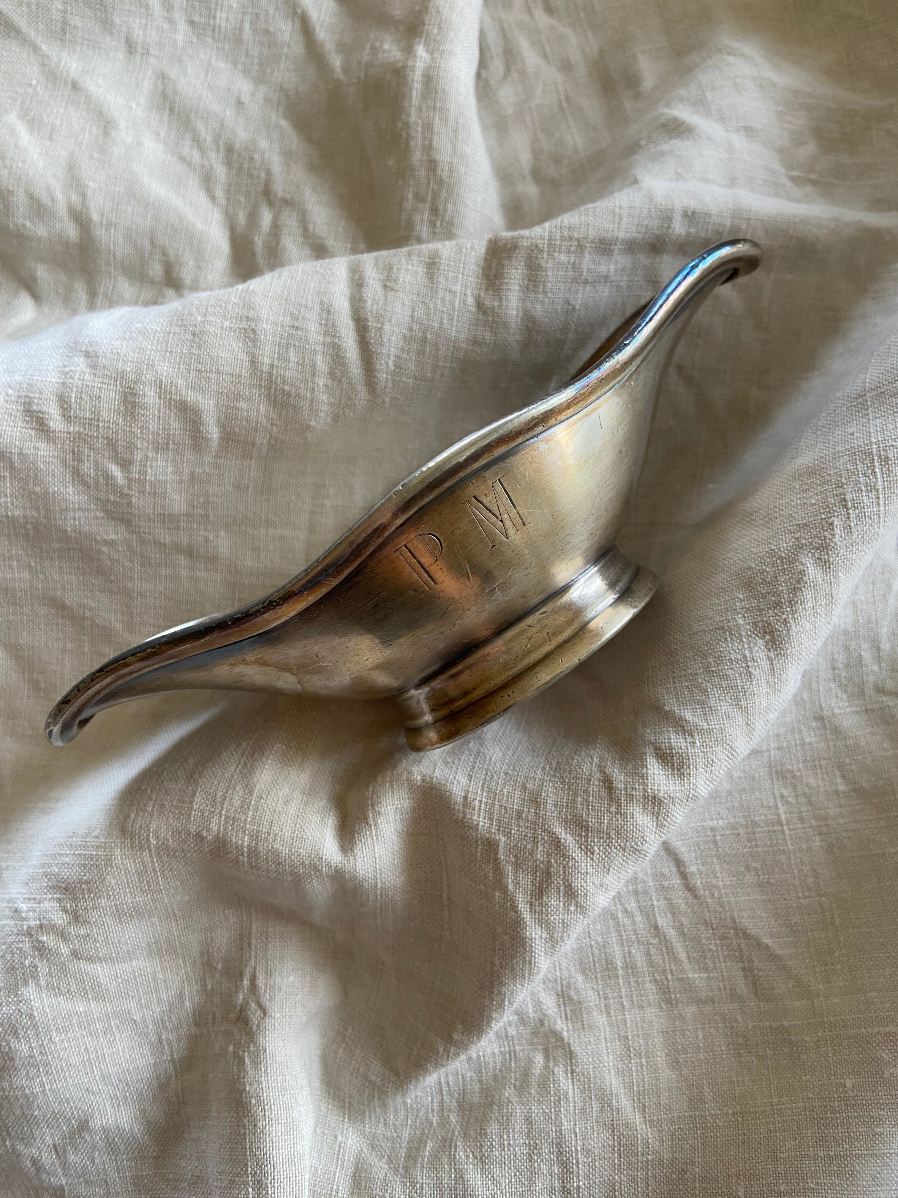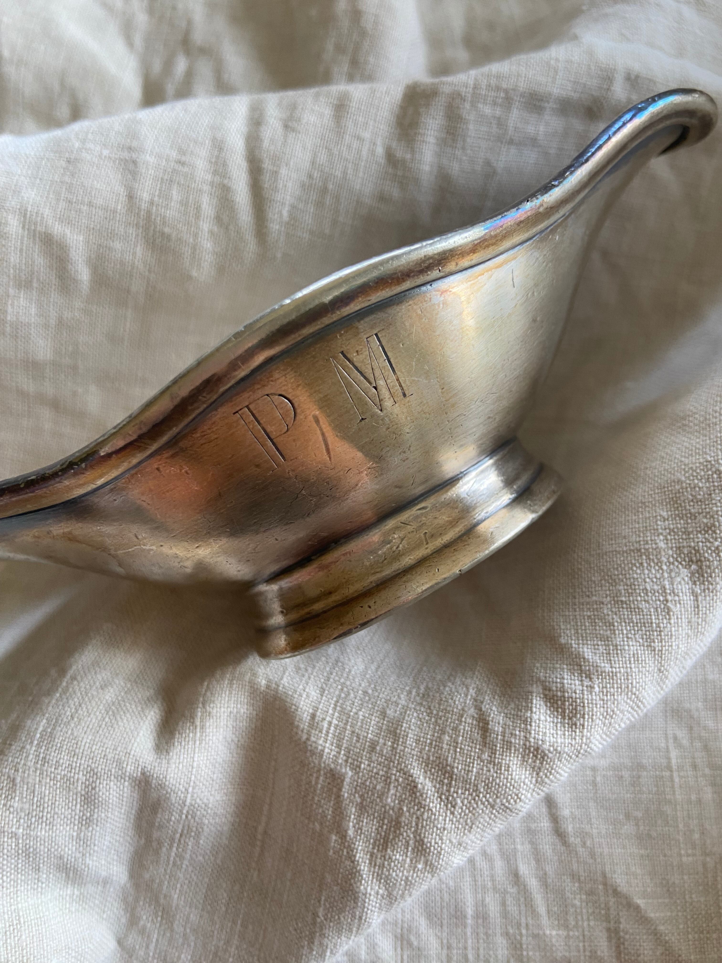 重さ、質感からピューターかなと思いましたが、内側の銀の剥がれを見るとシルバープレートなのかもと思います。